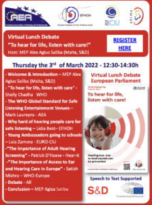 World Hearing Day 2022 was held with the theme of “To hear for life, listen with care!”. EFHOH, together with partners from AEA and EHIMA continued with the tradition of holding a  Parliamentary Lunch Debate. The Virtual Lunch Debate was hosted this year by MEP Alex Agius Saliba (Malta, S&D).