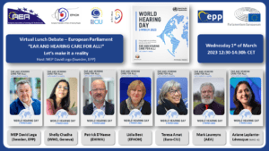 World Hearing Day 2023 was held with the theme of “Ear and hearing care for all! – Let’s make it a reality”. EFHOH, together with partners from AEA and EHIMA continued with the tradition of holding a  Parliamentary Lunch Debate. The Virtual Lunch Debate was hosted this year by MEP David Lega (Sweden, EPP).